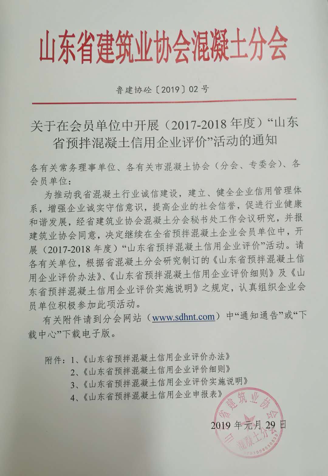 轉(zhuǎn)發(fā)關(guān)于在會員單位中開展(2017-2018年度)“山東省預(yù)拌混凝土信用企業(yè)評價”的通知