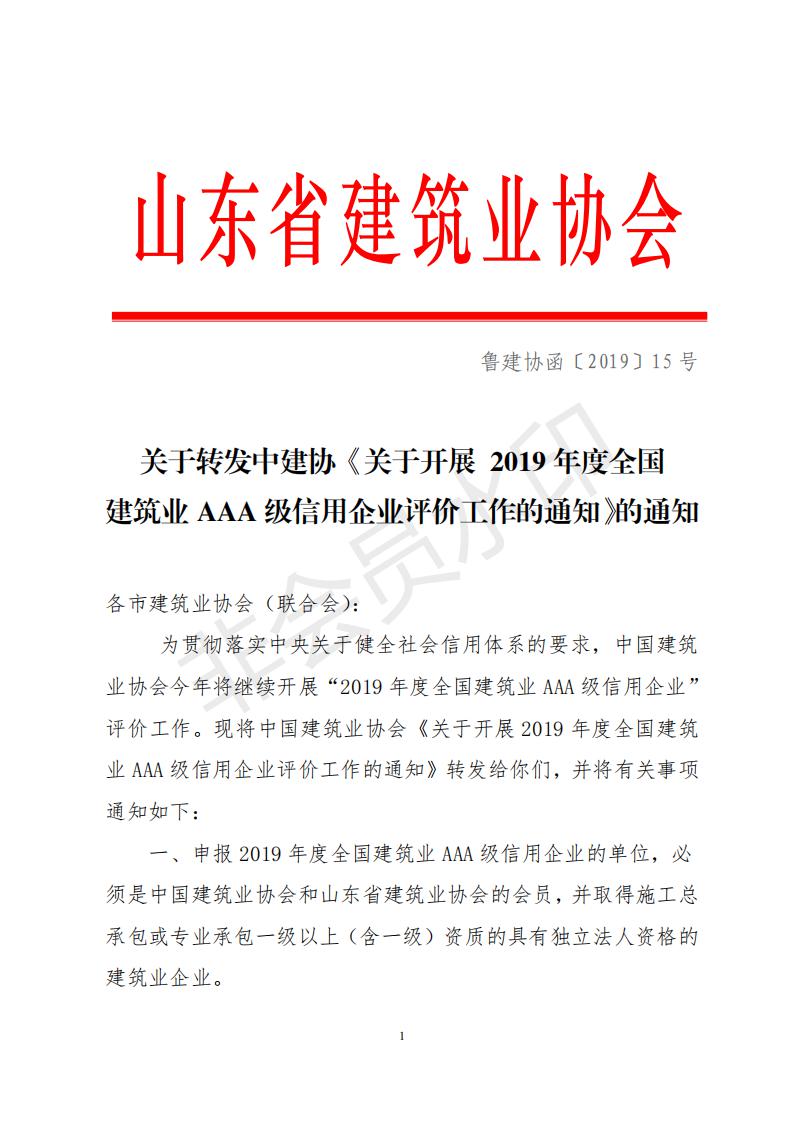 關(guān)于轉(zhuǎn)發(fā)中建協(xié)《關(guān)于開展2019年度全國 建筑業(yè)AAA級(jí)信用企業(yè)評(píng)價(jià)工作的通知》的通知