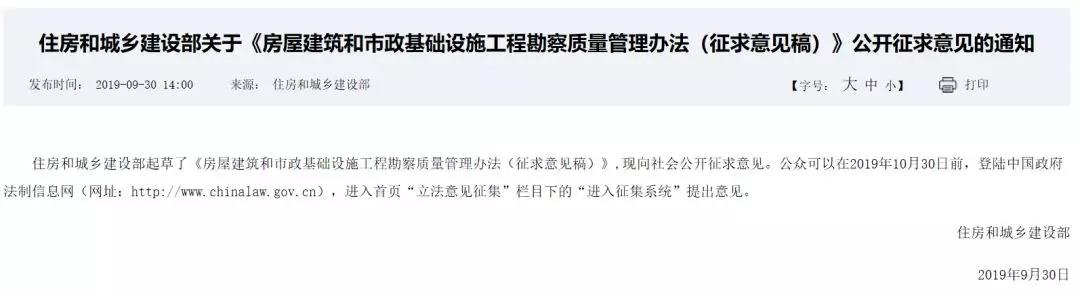 住房和城鄉(xiāng)建設(shè)部起草了《房屋建筑和市政基礎(chǔ)設(shè)施工程勘察質(zhì)量管理辦法(征求意見稿)》,現(xiàn)向社會公開征求意見。公眾可以在2019年10月30日前,登陸中國政府法制信息網(wǎng)(網(wǎng)址:http://www.chinalaw.gov.cn),進入首頁“立法意見征集”欄目下的“進入征集系統(tǒng)”提出意見。住房和城鄉(xiāng)建設(shè)部2019年9月30日《房屋建筑和市政基礎(chǔ)設(shè)施工程勘察質(zhì)量管理辦法(征求意見稿)》第一章 總則第一條 為了加強對房屋建筑和市政基礎(chǔ)設(shè)施工程勘察質(zhì)量的管理,保證工程勘察質(zhì)量,根據(jù)《中華人民共和國建筑法》《建設(shè)工程勘察設(shè)計管理條例》《建設(shè)工程質(zhì)量管理條例》《建設(shè)工程安全生產(chǎn)管理條例》等有關(guān)法律、法規(guī),制定本辦法。第二條 在中華人民共和國境內(nèi)從事房屋建筑和市政基礎(chǔ)設(shè)施工程(以下簡稱“工程”)勘察活動的,應(yīng)遵守本辦法。本辦法所稱勘察,是指根據(jù)工程要求,查明、分析、評價建設(shè)場地的地質(zhì)、環(huán)境特征和巖土工程條件,并提出合理技術(shù)建議,編制工程勘察文件的活動。本辦法所稱工程勘察文件,主要包括勘察綱要、勘察報告等文件。第三條 建設(shè)單位、勘察單位及相關(guān)人員應(yīng)依法對工程勘察質(zhì)量負責(zé)。第四條 國務(wù)院住房和城鄉(xiāng)建設(shè)主管部門負責(zé)全國工程勘察質(zhì)量活動的監(jiān)督管理。縣級以上地方人民政府住房和城鄉(xiāng)建設(shè)主管部門對本行政區(qū)域內(nèi)的工程勘察質(zhì)量實施監(jiān)督管理。第五條 工程勘察行業(yè)相關(guān)社會團體應(yīng)完善行業(yè)約束與懲戒機制,加強行業(yè)自律,維護公平競爭,規(guī)范勘察單位和人員依法從事工程勘察活動。第六條 鼓勵采用先進技術(shù)、工藝、設(shè)備、材料和管理方法,提高工程勘察質(zhì)量水平。第二章 責(zé)任和義務(wù)第七條 建設(shè)單位應(yīng)依法與勘察單位簽訂勘察合同,明確勘察任務(wù)要求、工期、費用以及各自的質(zhì)量責(zé)任義務(wù)。第八條 建設(shè)單位應(yīng)為勘察工作提供必要的現(xiàn)場工作條件。在勘察工作開展前,提供有關(guān)批準文件,勘察場地地形圖、地下管線及設(shè)施分布圖等與工程勘察有關(guān)的前期資料,并對資料的真實性、準確性、完整性負責(zé)。第九條 建設(shè)單位應(yīng)加強履約管理,及時足額支付勘察費用。建設(shè)單位可委托具有勘察資質(zhì)的第三方單位提供勘察質(zhì)量管理服務(wù)。建設(shè)單位應(yīng)按規(guī)定將工程勘察文件送施工圖審查機構(gòu)審查。建設(shè)單位應(yīng)組織勘察單位向設(shè)計單位、施工單位和監(jiān)理單位進行勘察技術(shù)交底。在基坑隱蔽前及時組織勘察單位、設(shè)計單位、施工單位、監(jiān)理單位等開展施工驗槽。第十條 勘察單位必須依法取得工程勘察資質(zhì)證書,并在資質(zhì)等級許可的范圍內(nèi)承接勘察業(yè)務(wù)。勘察單位應(yīng)按照有關(guān)法律法規(guī)、工程建設(shè)強制性標準、勘察合同及勘察任務(wù)要求開展勘察工作,編制工程勘察文件,并對工程勘察文件的真實性、準確性和完整性負責(zé)。工程勘察文件的編制深度應(yīng)符合國家規(guī)定的要求。第十一條 勘察單位應(yīng)按照有關(guān)規(guī)定,建立健全勘察質(zhì)量管理制度并確保有效運行。第十二條 勘察單位有權(quán)向建設(shè)單位提出保證工程勘察質(zhì)量所必需的現(xiàn)場工作條件、合理技術(shù)要求和合理工期。第十三條 勘察單位應(yīng)在勘探作業(yè)前向作業(yè)人員進行交底。勘察單位應(yīng)嚴格執(zhí)行勘察綱要和勘察操作規(guī)程,采取措施保證各類管線、設(shè)施和周邊建筑物、構(gòu)筑物的安全,并做好安全記錄。第十四條 勘察單位應(yīng)按照規(guī)范要求對試驗樣品的取樣、密封、送樣、保管、試驗進行管理。第十五條 勘察單位應(yīng)保證工程勘察工作原始記錄的真實和準確,并應(yīng)在勘察過程中及時整理、核對,嚴禁離開現(xiàn)場追記或者補記。項目負責(zé)人或其授權(quán)人員應(yīng)及時對原始記錄進行驗收簽字。鼓勵勘察單位采用信息化手段,實時采集、記錄、存儲工程勘察數(shù)據(jù)。鼓勵勘察單位采用影像等方式對鉆探、取樣、原位測試、室內(nèi)試驗等主要過程進行記錄。勘察單位在原始記錄中不得存在下列情形:(一)紙質(zhì)原始記錄與電子存儲記錄不一致的;(二)試驗、測試報告與試驗、測試的過程記錄資料不符的;(三)未按規(guī)定記錄原始數(shù)據(jù)的;(四)各類記錄和報告的時間與原始記錄和報告的時間不一致的。第十六條 勘察單位應(yīng)確保勘探、取樣、原位測試、室內(nèi)試驗及測量等儀器和設(shè)備符合有關(guān)規(guī)定。嚴禁使用不符合規(guī)定的儀器和設(shè)備。第十七條 勘察單位依法委托具備條件的單位承擔(dān)勘探、試驗、測試工作的,勘察單位對委托的勘察工作質(zhì)量負責(zé)。第十八條 勘察單位應(yīng)對勘察從業(yè)人員開展職業(yè)技能培訓(xùn),提高勘察人員的技能水平和質(zhì)量責(zé)任意識。司鉆員、描述員、土工試驗員等作業(yè)人員應(