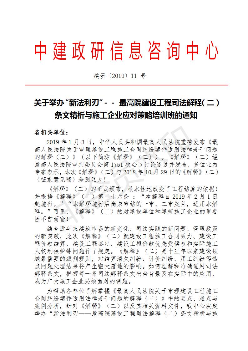 關于舉辦“新法利刃”—最高院建設工程司法解釋(二) 條文精析與施工企業(yè)應對策略培訓班的通知