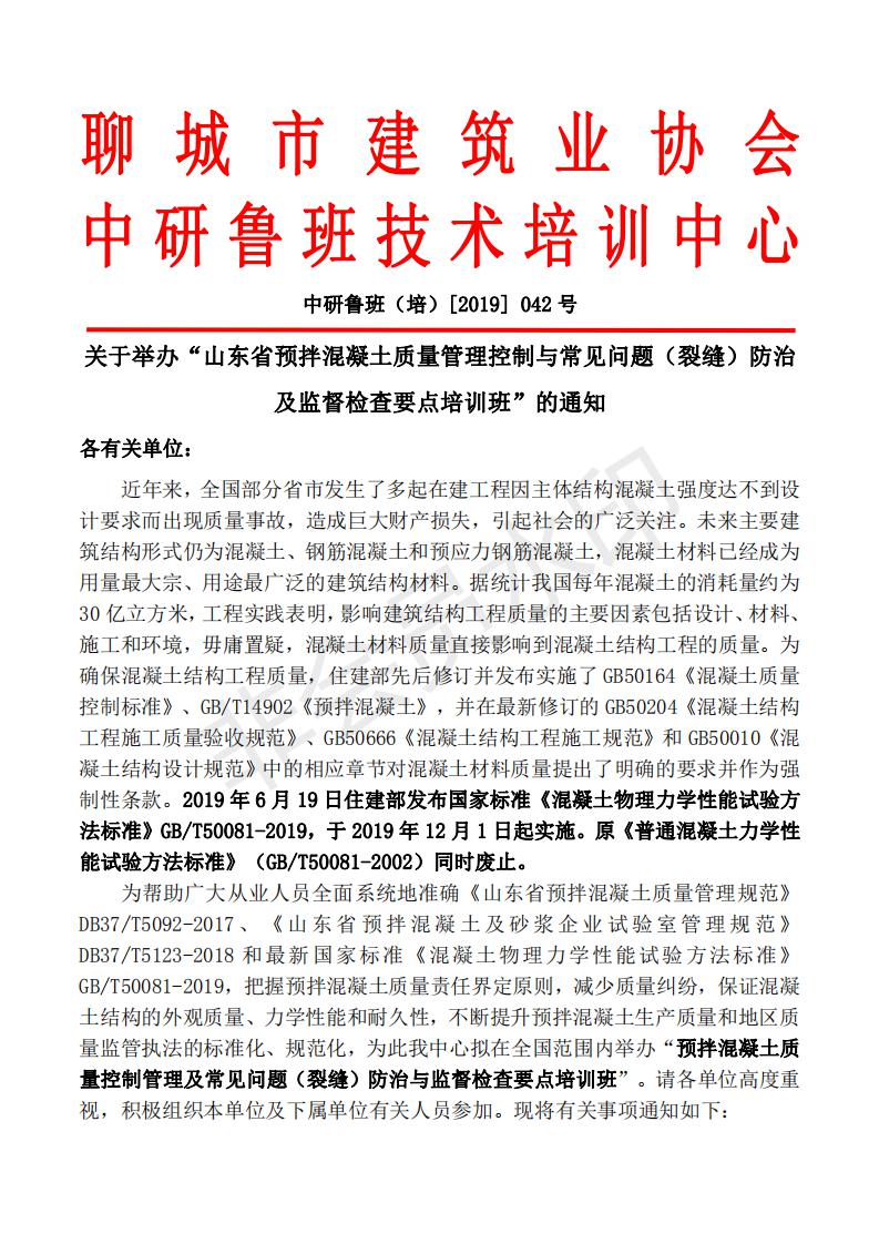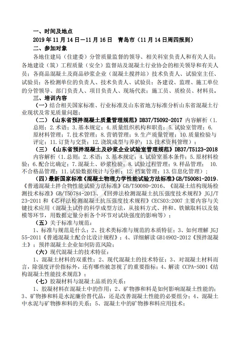 關(guān)于舉辦“山東省預(yù)拌混凝土質(zhì)量管理控制與常見問題(裂縫)防治 及監(jiān)督檢查要點(diǎn)培訓(xùn)班”的通知